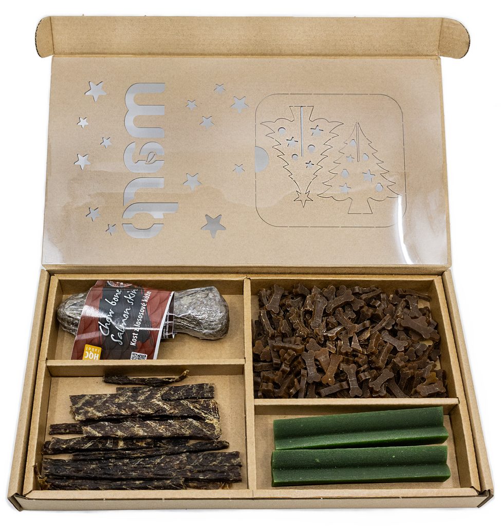 Vianočný maškrtný box Marp s vianočnou dekoráciou. Pravý darček pre štvornohého psieho parťáka!