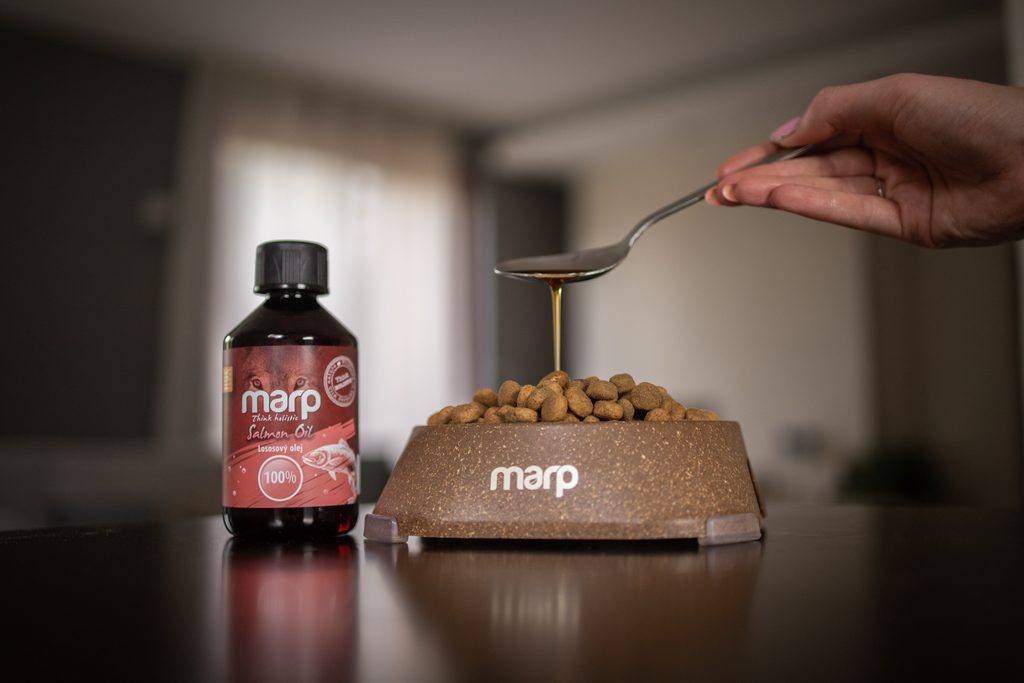 Špičkové oleja z radu Marp Holistic môžete pridávať ku granulám, konzervám, doma pripravené alebo surovej strave.