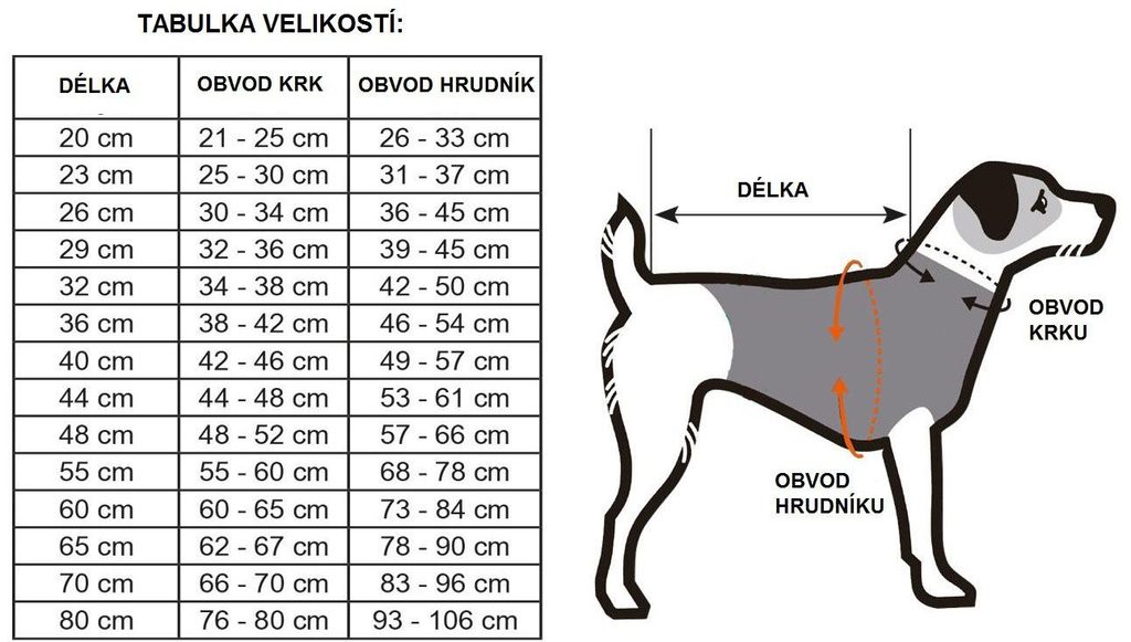 Veľkosť: 23 cm (dĺžka chrbta)Obleček vyberajte podľa dĺžky chrbta psíka. Zmerajte psíkovi dĺžku chrbta (pred prednými lopatkami po koreň chvosta) a vyberte obleček zhodné alebo najbližší dĺžky (je uvedená v názve oblečku). Následne premerajte obvod pri krku a okolo hrudníka (najširšie miesto za prednými labkami, viz. obrázok "tabuľka veľkostí" oranžová šípka).