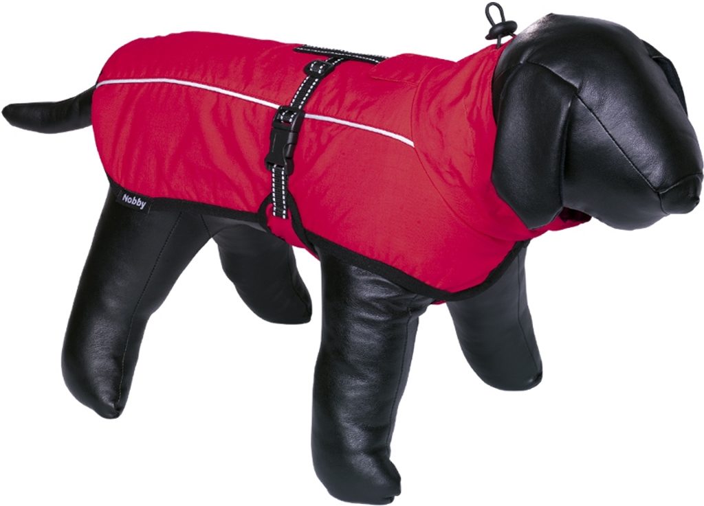 Športová vesta pre psa Nobby Timis v červenej farbe s reflexnými pruhmi. Oblek má veľmi jednoduché zapínanie na nastaviteľný bedrový pás so zapínaním na plastovú sponu.