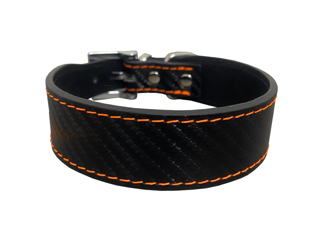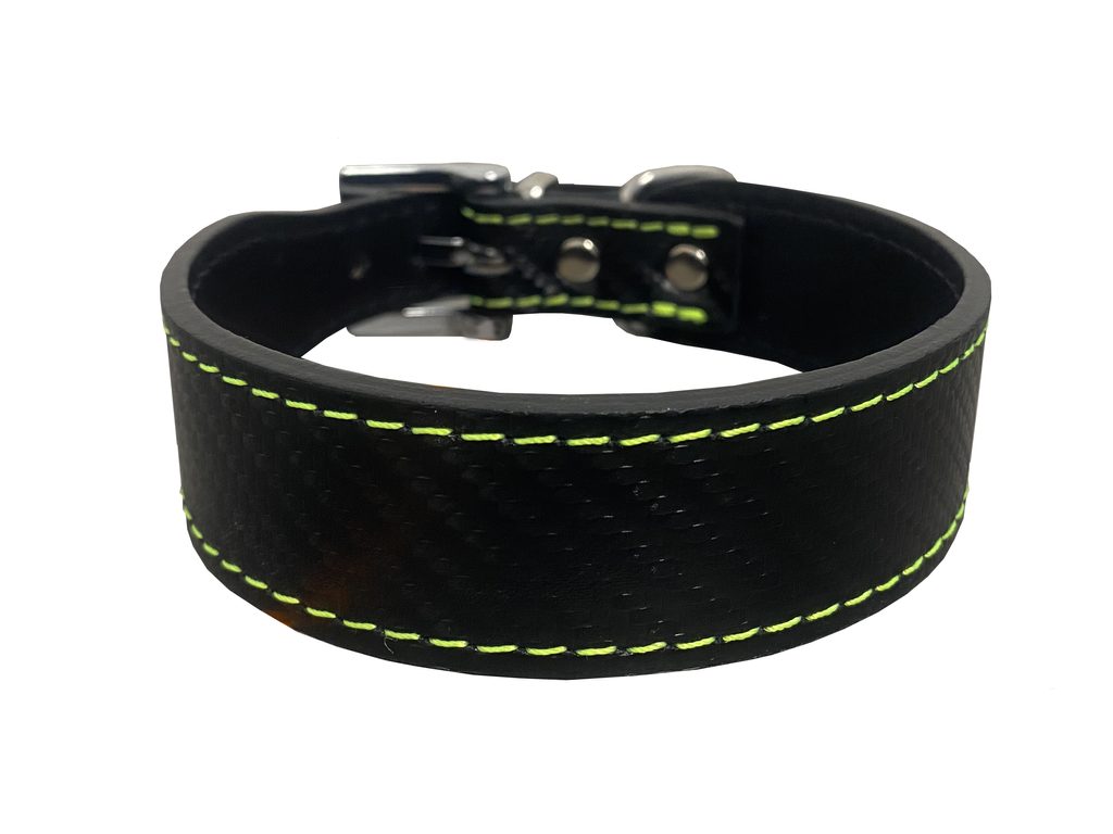 Kožený obojok pre psov s carbonovým vzhľadom, neónovým prešitím a mäkkým podšitím pre menšie plemená