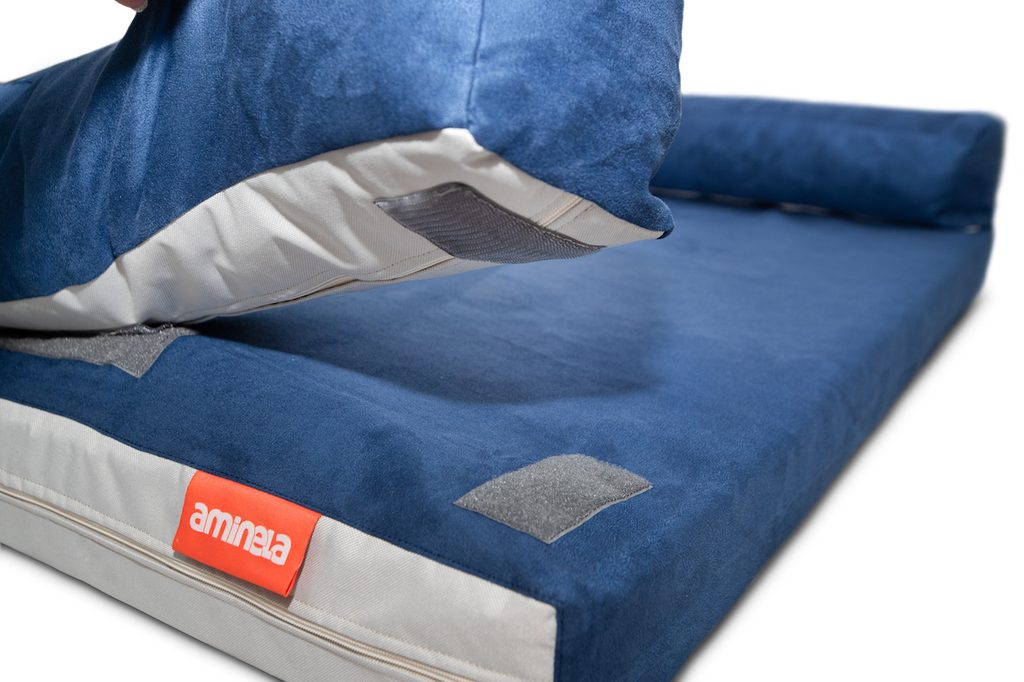 Matrac Aminela sa skladá z dvoch odolných materiálov, z vodonepriepustného materiálu a mäkkého, hebkého, avšak pevného a vodoodpudivého materiálu, ktorý nešustí a pre psa je veľmi pohodlný. Zo rovnako hebkého a pohodlného materiálu je vyrobený okraj, ktorý sa na matraci prichytí pomocou suchých zipsov. Kedykoľvek sa dá okraj odlepiť a zase nalepiť.