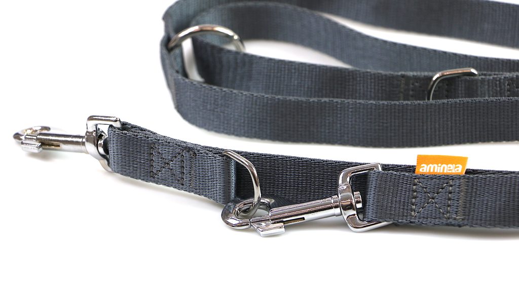 Výhodou prepínacieho vodítka je karabína na každom konci vodítka a tri kovové krúžky všité do vodidla v troch vzdialenostiach. Každým prepnutím sa vytvorí rukoväť a priestor pre psa. Vodítko Aminela má vpletené 3 očká, takže získate vodítko v troch dĺžkach - cca 185cm, 135cm a 105cm.